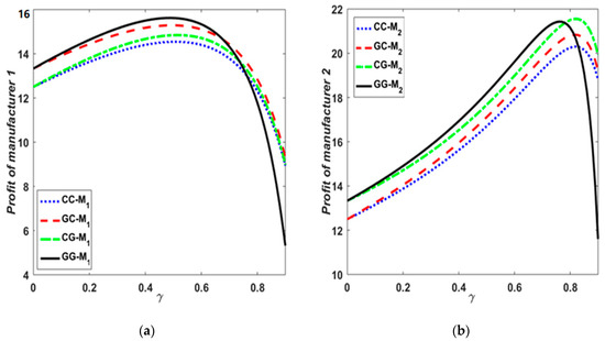 According to Figure 3, with the increase of competition between the two supply chains, manufacturers’ profits in the different decision scenarios show a trend of increasing first and then decreasing. The reason is that, as competition intensifies, manufacturers gain more demand by lowering wholesale prices and increasing the greenness of their products. Therefore, manufacturers’ profits increase accordingly. However, when the competition is very fierce, the wholesale price will continue to decrease, which means that the profit resulting from the increased demand is unable to make up for the green input cost of the manufacturers, so the overall profit of the manufacturers decreases.