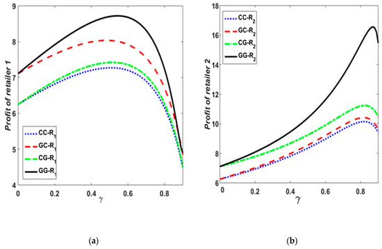 As a follower in the supply chain network, the retailer is strongly influenced by the manufacturer’s strategy. As can be seen from Figure 4, with the intensification of the competition between supply chains, retailers’ profits under different decision scenarios show a trend of increasing first and then decreasing, and is always true. This indicates that for the retailer, no matter how the competition degree changes, choosing green products is always the dominant strategy to maximize its own profits. Nevertheless, according to Proposition 5, if one supply chain chooses to produce green products when the competition is not fierce, the other’s dominant strategy is also to produce green products, which will maximize the profits of both sides. When the competition is very fierce, the other manufacturer’s dominant strategy is to produce non-green products, i.e., the GC or CG strategy. Therefore, the optimal strategies of manufacturers and retailers will be different. For the retailer, its profit will be affected by the manufacturers’ strategies. In addition, according to Figure 4, Retailer 1’s profit changes more gently than that of Retailer 2, that is, the range of increase or decrease of the retailer’s profit caused by the change of competition degree per unit is smaller. This indicates that Retailer 2 is more sensitive to changes in inter-supply-chain competition. The reason is that the follower, Supply Chain 2, is in a subordinate position in the competition. Retailer 2 must make corresponding decisions based on the strategies of Manufacturer 2 and the leader, Supply Chain 1, to maximize its own profit.