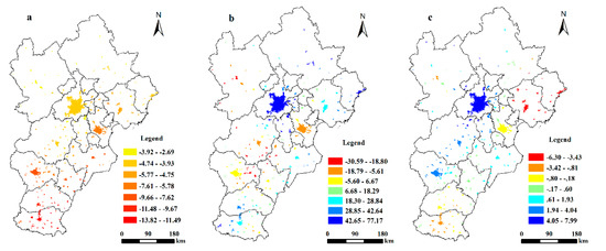 As can be seen from Figure 2, the annual precipitation showed a decreasing trend in the Jing–Jin–Ji urban agglomeration from 2000 to 2015 (Figure 2a). The significant decrease in annual precipitation was mainly located in the southern region, while there was a relatively small decrease in the northern region, which shows a trend of gradual decrease from south to north. From the cold–hot spot analysis diagram (Figure S1a), the trend of accumulation precipitation decrease has no significant variation in the towns of Handan, Hengshui, and Cangzhou of the Jing–Jin–Ji urban agglomeration, and two centers are formed when taking the towns of these three areas as a boundary: Beijing is regarded as the center in the north where the precipitation is decreasing, while the city of Handan is taken as the center in the south where the precipitation is become decreasing (Figure 1). Both two centers have passed the significance test of 99%. In summer, the increase in precipitation was mainly concentrated in the larger urban area of Beijing, the small towns in the northeast of Qinhuangdao, and some small towns in the south of Handan City. The decrease in cumulative precipitation was mainly distributed in the towns around Shijiazhuang and Hengshui of Hebei province (Figure 2b). From the analysis of cold–hot spots of precipitation change from 2000 to 2015, it can be seen that regions with decreased and slightly increased precipitation all passed the significance test of 99% (Figure S1b), while other regions do not show significant changes. In winter, the slight increase in precipitation was mainly distributed in urban areas of Beijing as well as in the cities and towns of Baoding and Shijiazhuang. The precipitation showed a decreasing trend in the northeast of Tangshan, in the cities and towns of Qinhuangdao and Xingtai as well as in the south of Handan (Figure 2c). From the analysis of cold–hot spots, according to the precipitation increase or decrease in the cities and towns located in the Jing–Jin–Ji urban agglomeration in winter, three regional zones can be created to show the amount of precipitation: the decreasing zones refer to the northeast and the south, and the increasing zone was Beijing–Baoding–Shijiazhuang (Figure S1c).