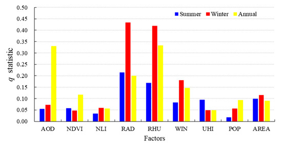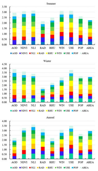 This study makes use of linear regression analysis to calculate the changing situation of AOD, AREA, NDVI, NLI, POP, RAD, RHU, UHI, and WIN in summer and winter in 2000–2015, and the change slope of each factor from 2000 to 2015 was obtained (Figure S2).
