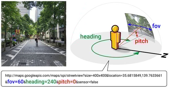 In this study, we process images extracted from Google Street View (GSV) for each site. Figure 1 illustrates the process of image retrieval from Google Street View API. At each site, six images with interval allow to capture all surrounding scenery of the site (heading), whereas four images with interval may fail to capture objects at directions. The vertical view angle (pitch) is fixed to , which is parallel to the horizontal line.