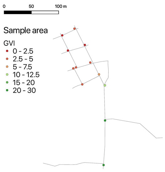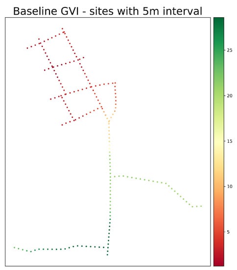 Table 2 provides the result of estimations from different metrics, applied to the network shown in Figure 2 and Figure 4. Among the three estimations from sampled sites with 100 m interval, sGVI (calculated with sampled sites with 100 m interval) showed the highest precision compared to the baseline (calculated from the sites with 5 m interval). On the other hand, GVI (mean) and GVI (median) were 28.4% and 69.8% smaller than the baseline respectively. This means that these metrics are biased toward the value where the density of sampled sites is high, although the metrics have often been used in previous studies.