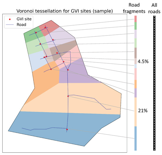 One of the advantages of using the Voronoi tessellation over other methods is that every part of the roads is automatically associated with one site, without duplication. Given that the sites for GVI evaluation is located on a road segment, by definition, all the cells in the tessellation are supposed to have at least a fragment of road segment. In addition, since the cells do not overlay each other, it is ensured that one fragment of road segment is associated with only one site. This property may not be the case with other methods based on network configuration: for instance, if one decides to associate a site with nearby road segments, it is possible that two points in different road segments have the same distance from the site. An additional rule of attribution is needed in order to avoid duplicated association. The Voronoi tessellation, in turn, requires only the sites, the road segments and the boundary, and no other parameter is needed. As the Equation (2) indicates, quasi inverse weighting of GVI sites in terms of site density can be achieved with possibility of simple application in practice.