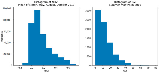 Figure 7 shows the histograms of NDVI and GVI for the study area, and the descriptive information is shown in Table 3.