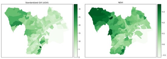 In the aim of exploring the above question, second, the geographical distribution of the estimated values was explored. Figure 9 visually compares sGVI and NDVI calculated at Chome level. Even though the scales of value between sGVI and NDVI are not directly comparable, there is an observable tendency that NDVI leverages the vegetation in the north-west part of the study area.