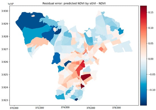 Spatial distribution of residual error from the regression analysis is also illustrated in Figure 10. Under an assumption that the relation between sGVI and NDVI can be modeled by a linear function, NDVI in the north-west part where vegetation is more present is larger than what sGVI predicts, and NDVI in the south-east part where buildings are more dominant is smaller than the prediction by sGVI.