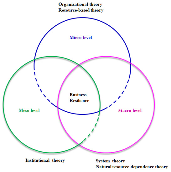 It is significant to point out that many reactions of businesses on climate change problems are strongly associated with institutional pressures and could be explained through the institutional theory lens. Institutional theory posits the many types of external pressures that stimulate enterprises to adopt strategies to address environmental and climate change problems. For instance, Escobar and Vredenburg [69] pointed out the three forms of isomorphism described by neo-institutional theory (coercive isomorphism, normative isomorphism and mimetic isomorphism) in explaining sustainability transitions in firms. The first two types reflecting aspects of the regulatory regime can affect decisions of businesses regarding climate change and weather extremes impacts. The third form explains business climate change adaptation and resilience building behavior as a mimetic process driven by peer firms. This (mimetic) effect can be placed in the second (meso-) level while the first two forms of isomorphism in the third (macro-) level (indicated by the dashed green line in the figure). It is worth noting that cooperation of businesses at the meso-level could be so explained from a systems theory perspective. Several scholars suggest that cooperation of businesses in an industrial ecology context plays a critical role in resilience capacity building against environmental change [70,71]. This viewpoint also lends support to the theoretical connection between institutional theory and systems theory to further clarify how business participatory and multi-stakeholder actions can be a meaningful planning endeavor to address EWEs.