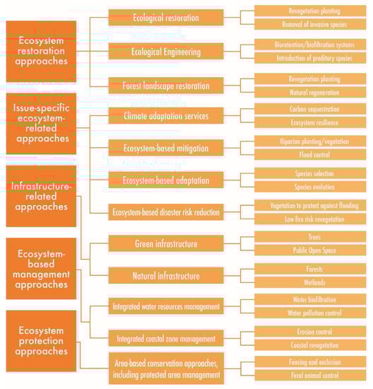 Traditional and foundational means of managing climate change are embedded in NBS. As described by the International Union for the Conservation of Nature (IUCN) [47], NBS are actions and assets that manage, restore, and/or protect natural (or modified) ecosystems which positively affect social, economic, ecological, environmental, and political impacts brought about by climate change (and other contemporary challenges). NBS is wide ranging and widely applicable (i.e., Figure 1).