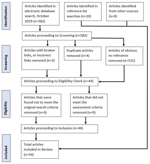 The abstracts of the 44 articles were carefully screened and it was determined that all were eligible for inclusion in the review. A further 10 articles were identified through a targeted reference list search. At the completion of this process, 54 articles were deemed suitable and therefore formed the content of this review. This process as described above is captured in graphical form shown below in Figure 2.