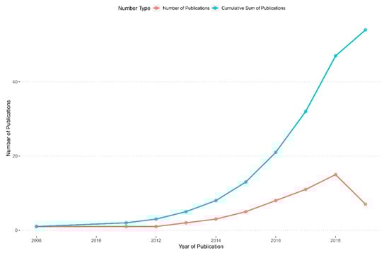 Of all articles (n = 54) collected within the QSLR, analysis was undertaken to understand the relationship between calendar year and the associated publication rates highlighting any emerging trends. It was found that the first article was published in 2012, with a subsequent strong trend showing a uniformed positively curved increase in research effort for each year thereafter. It is to be noted that the drop off between 2018 and 2019 is partially (at least) attributed to timing of the searching of articles and the expected delay in articles becoming discoverable via online database searches after publication. Figure 3 below, shows both the actual number of publications as well as the cumulative sum of publications of articles within the review.
