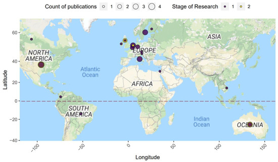 For the articles that indicated a geographical publishing location; country (n = 27, 50%) and city (n = 22, 40%), heat maps were produced to display the distribution of research effort. Of those articles that reported geographic location, 81% related to the implementation of NBS as a response to climate change in urban centers. As can be seen in Figure 4, most articles were published in The Netherlands (n = 4), Italy (n = 3), and Sweden (n = 3).