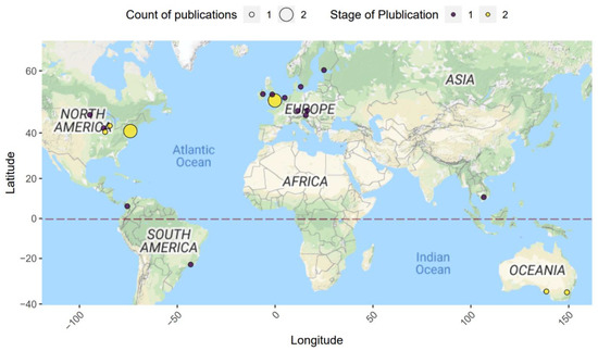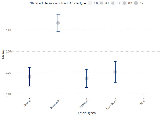 As reported in Section 4.4, the vast majority of articles were identified as being of a traditional research article style (83%), with the other formats being only modestly represented (less than 14%). This may indicate that the research field is in an infant state with novel development and exploratory research being progressed in favor of reviewing existing research or undertaking more specific and refined research such as case studies, or technical articles [4]. Based on the first included article published in 2012, it would be expected that these proportions would soon begin to change and that greater balance between article types would emerge. Additional time would be required to determine if/when this becomes the case.