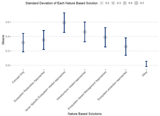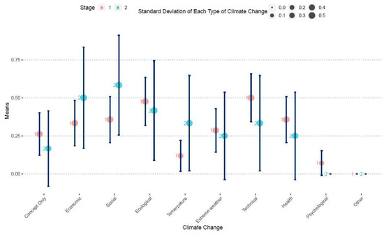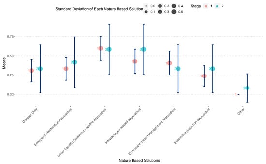 A mean value error plot showing each data stage was produced for the aspects recorded as being present for NBS and then reproduced for the aspects recorded as being present for climate change. These are provided below as Figure 6 and Figure 7.