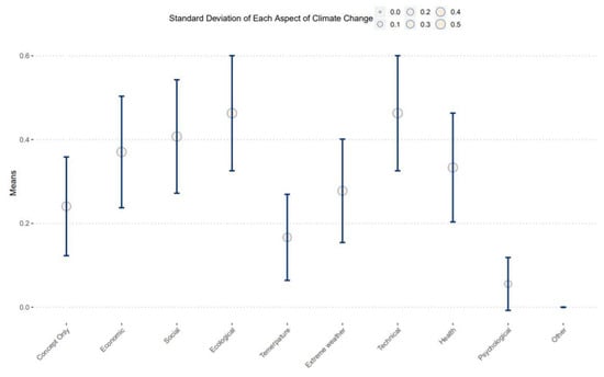 Ecological and technical aspects returned the highest rate of occurrence among the climate change content (n = 25, 46%), followed by social (n = 22, 41%), economic (n = 20, 37%), and health (n = 18, 33%). The remaining aspects were lower in frequency, particularly evident for the psychological aspect (n = 3, 5.5%).