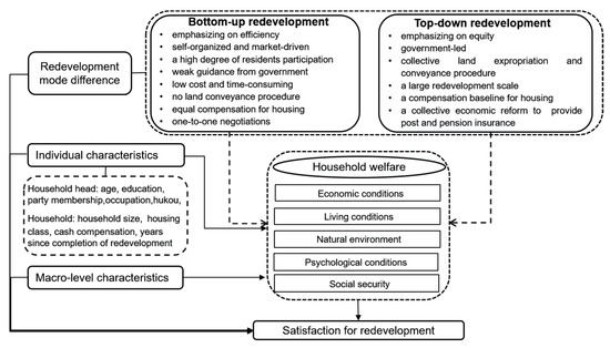 With regard to macro-level characteristics, welfare of the villagers is likely to vary with factors like geographic location [58] and resource endowment at the village-level [59] and political environment at the district-level [60]. For instance, geographic location greatly influenced housing value and commuting convenience of villagers, which are important components of welfare. Residents of the villages closer to the city center may share more housing value-added dividends in the redevelopment [23,24]. It is easier to develop economically for those villages with better endowment of land resources [59]. Political environment is a critical factor to be considered in solving environmental problems, enhancing management and delivering public services in urban village redevelopment [61]. Various redevelopment polices typically emerge within political environments in different administrative districts. Therefore, macro-level characteristics are considered as an influence on multidimensional welfare.
