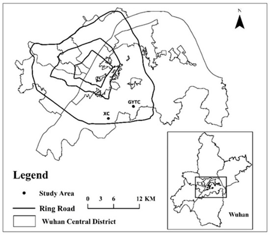 Location of the study area (Note: the two survey sites of our study are marked as Xiyuan Community (XC), Guanggu Youth Town Community (GYTC), respectively, by the author).