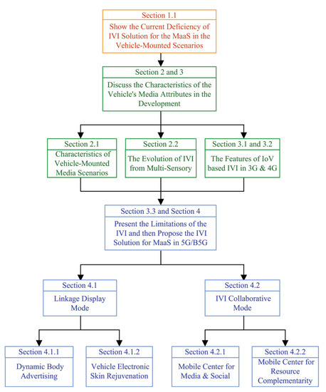 As shown in Figure 1, the rest of this paper is organized as follows: Section 2 presents the characteristics of vehicle-mounted scenarios and the IVI evolution from the senses of hearing, vision, and multi-sensory services. Section 3 illustrates the main characteristics and limitations of the IoV-based IVI in the era of 3G/4G. Section 4 constructs IVI media scenarios as an indispensable part of the MaaS ecosystem in 5G/B5G. The linkage display mode and IVI collaborative mode are illustrated. Finally, Section 5 concludes this paper.