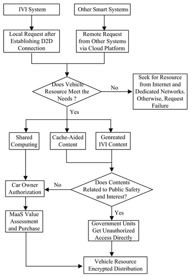 As depicted in Figure 4, in terms of interoperability, the vehicle as the super media could connect with both Internet-based ecosystems and traditional transport infrastructures under the complex heterogenous networks. Once a vehicle receives the IVI requests from users (e.g., occupants and observers) or institutes, it will assess whether its own capacity or database can take on the task or not. If the vehicle can satisfy the requirement and meanwhile the car owners authorize the request, with the universal standardization, all kinds of resources can be shared and exchanged without blockage via D2D links or cloud platform, where the resource collaboration is achieved by interoperating between the IVI system and other smart systems. In this way, the interoperability could be enhanced compared with current proprietary IVI systems as shown in Table 3 and Table 4. Otherwise, if the vehicle can not meet the need of the requester or the selected car owner refuses to deliver the contents and share the software and hardware resource, other homogeneous IVI services will be sought for in the Internet or dedicated networks again.