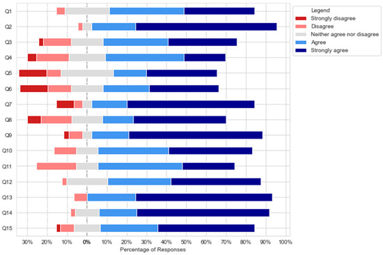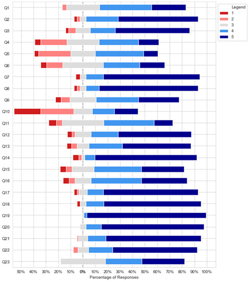 The survey data were analyzed using mean (M), standard deviation (SD), and median absolute deviation (MAD), as well as the median (MED) value, which is more representative of the central tendency in scaled non-normal distributions such as those of Likert-type variables. In addition, Cronbach’s alpha (α) was calculated in order to assess the internal consistency of both surveys, confirming their reliability at α > 0.9 for both of them. Furthermore, in view of the reduced number of responses to the open-ended questions, only an informal qualitative analysis was performed on these.