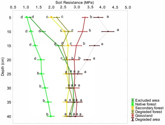 The highest values (>4 MPa) of soil penetration resistance were recorded both in the degraded area (nearly buildings) and in the grassland, i.e., in those parts of the farms in which animals graze for more time (Figure 3). These high values were observed until a depth of 20 cm, i.e., the soil layer in which herbaceous roots perform their crucial activities. Contrariwise, the lowest values were recorded both in the excluded area and in the forest. Therefore, it is important to state that an excluded area can reach values comparable to forest areas after 10 years of exclusion. Secondary and degraded forest showed intermediate values, confirming a gradient of degradation caused by grazing pressure.