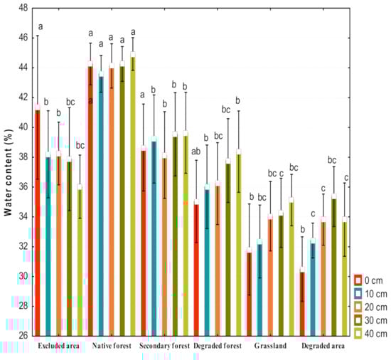 Other important disturbance caused by grazing is the removal of litter, naturally accumulated on the soil surface [21]. Litter is a good nature-based solution to retain soil water due to its capacity to reduce evaporation, among other advantages [22]. This has been confirmed in the high values observed in the native forest, even at 10 cm in depth. The excluded area showed values of soil water 77% higher than in the grassland. It can be an effect of the recovery of vegetation through the reduction in evaporation and an increase in the capacity of infiltration; i.e., less water is released to the air and more is stored in the soil [23].