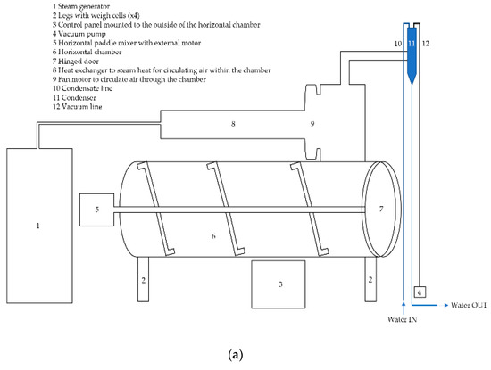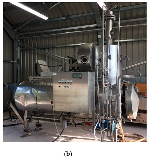 In the current study, we focused on testing and validating a novel nitrogen recovery process (NRP) developed by Alchemy Utilities Ltd. The Alchemy Utilities NRP involved a pilot-scale (1 m3) batch reactor that was tested as a pre-commercial prototype, related to patent number WO 2019/092314 AI [11]. The NRP prototype employed an electrically heated horizontal chamber with an internal paddle mixing system to agitate the CM, increasing volatilisation. Steam- and electrically heated air was used to volatilise ammonium in the CM as it was mixed. The volatilised ammonium air stream was then removed from the chamber using a vacuum pump and solubilised in an aqueous stream in a condensation system (see Figure 1a,b). The ammonium in the condensation stream was recovered using acid precipitation in the laboratory. Following the removal and recovery of ammonium nitrogen from fresh layer CM, wet biochemical methane potential (BMP) assays were performed on the treated CM. BMP assays were also performed on fresh CM (control) that was not subjected to the NRP. The overall aim of this research was to investigate and quantify the removal of ammonium nitrogen from fresh layers’ CM using the NRP and to determine if NRP-treated CM would increase methane yield in comparison to the untreated fresh CM. If successful, this research could provide an initial assessment as to the suitability of decentralised, farm-scale nitrogen recovery from CM to be used as a nitrogen source for further fertiliser production. Additionally, pre-treating the CM through the NRP may provide a valorisation method for CM to be a more competitive feedstock for AD plants, reducing the inhibition effects that can be seen compared to digesting fresh CM. If this is achievable, AD plants could digest greater quantities of CM and create a better revenue stream for chicken producers. The NRP works on the concept of processing a smaller quantity of feedstock, rather than processing vast quantities of liquid digestate to remove nitrogen. Further, by recovering the nitrogen as ammonium nitrate/sulphate, this by-product has further valorisation pathways to increase revenue. Therefore, the NRP may present a more economic, energy-efficient process to be undertaken at the farm scale compared to some of the other technologies currently being researched. The purpose of the research is not to compete with current larger-scale, centralised nitrogen fertiliser manufacturing technologies, but to look for novel decentralised valorisation opportunities.