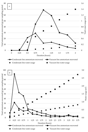 These pH increases were attributed to ammonium. The Short-test recovered a higher weight of ammonium from the vacuum line compared to the condensate line, with most of the ammonium in both the Short- and Long-test recovered between 0.5 and 1.5 h of operation. The condensate line demonstrated an earlier increase in ammonium recovery, within 15 min of the start for one hour, but the concentration was lower (Figure 3a). For the Long-test, ammonium recovery was greater for the condensate line compared to the vacuum line (Figure 3b), with the majority of the ammonium recovered within the first hour of sampling. After the first hour, there was a gradual reduction in ammonium recovery from both lines. The water usage was considerably greater for the Long-test compared to the Short-test, due to the longer duration of the experiment. However, the water usage was similar between both experiments for the first two hours of operation, with the vacuum line consuming more water than the condensate line (Figure 3a,b). Overall, the Short-test recovered a total of 95.7 g of ammonium in the condensate line using 0.15 m3 of water and 241.1 g ammonium from the vacuum line using 1.4 m3 of water. The Long-test recovered a total of 285.5 g of ammonium from the condensate line, using 0.81 m3 of water and 132.9 g ammonium and 2.72 m3 of water in the vacuum line. To precipitate the ammonium from the solution, 1.88 mL of 0.1 M sulfuric acid was required per 100 mL of condensate water, to recover 0.036 g of ammonium sulphate.