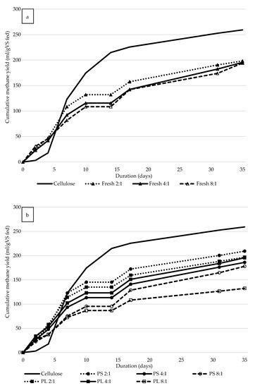 The cumulative methane yield (mL/gVS fed) for all treatments increased from the beginning of the experiment and plateaued between days 10 and 15 before increasing again to day 31. The experiment was stopped at day 35, five days after there was minimal increase in methane yield (Figure 4a,b). The cellulose control demonstrated a lag phase in methane production during the first five days of the experiment and then increased exponentially until day 14. Thereafter, gas production slowed until the end of the experiment.