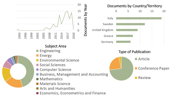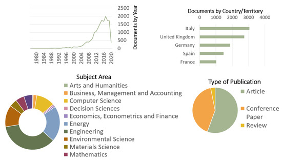 - Appropriate work boundaries were defined. Only Articles, Conference papers and Reviews written in English and dealing with the topic in European Countries were considered. Moreover, the search was limited to the subject areas of “Engineering”, “Energy”, “Environmental Science”, “Business, Management and Accounting”, “Economics, Econometrics and Finance”, “Arts and Humanities” (referred to as built heritage), “Computer Science”, “Material Science”, “Mathematics and Social Science”.
