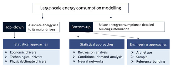 In general, building energy modelling and procedures can be categorized into top-down and bottom-up approaches [16,17], as illustrated in Figure 3. Top-down approaches study interactions between energy use and its main drivers [18], including demographic growth [118], macroeconomic indicators, constructions/demolitions rates, policy changes, market conditions, energy prices [119], weather [120], consumer preferences or technological innovation [121]. Top-down models are based on statistical techniques, such as regression analysis [122] or search algorithms [123], and they can be categorized due to the variables analyzed. Econometric models are primarily based on prices and incomes [124,125]. Technological models link the energy consumption to widespread building characteristics of the stock, while physical models rely on climate, weather, and temperature data [126]. Top-down techniques are based on aggregate information, which does not give sufficient knowledge of individual buildings and single energy end-use. These approaches can only represent energy consumptions at an aggregate level.