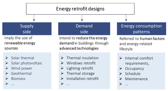 The second key aspect analyzed in this paper concerns the design of energy retrofit actions for building portfolios. According to [18], building retrofit measures could show three different orientations. The first focuses on the supply side, the second on the demand side, while the third addresses the changing of energy consumption patterns (Figure 4). Supply side retrofit measures involve the use of renewable energy [146,147] like solar thermal, photovoltaic [148], wind power, biomass or geothermal [149,150]. Several works presented the importance and significance of renewable energy use in buildings, suggesting programs, methods, and strategies to incorporate renewable sources in retrofit actions [151,152,153,154,155]. The most frequent type of energy measures in building retrofits concerns the demand side [156,157,158,159,160,161,162,163], where a decrease in a building’s energy demand is achieved by introducing new technologies, thermal storage or heat recovery systems [164,165,166,167], or through the use of passive technologies [168] such as shading systems [169,170,171,172], natural ventilation [173,174] and site planning [175,176,177]. Lastly, building energy demand could also be significantly reduced simply by a change in energy consumption patterns [178,179]. This involves human factors or, in other words, how occupants decide to set their internal comfort criteria, as well as their energy related and environmental lifestyle including occupancy profiles, schedule, space use, intelligent control system, zonal heating or internal temperature [180,181,182,183].