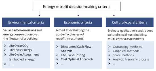 The third pivotal issue analyzed for this work involves the decision-making criteria used to compare and rank energy retrofit alternative scenarios. Assessment rules vary considerably, and they are aimed at evaluating the performance and the sustainability of different designs. As stated in [19], assessment criteria could be categorized into environmental, economic and social ones, as in Figure 5. Environmental criteria measure pollution, greenhouse gases, CO2 emissions, or energy consumption during a period of analysis. When accounting for energy consumption, both the operating energy and embodied energy used over the lifecycle of a building should be included [195]. While the operating energy is defined as the amount of energy consumed by a building to satisfy its heating, cooling and electricity requirements, the embodied energy is the total amount of energy used in buildings and buildings’ materials during the entire process of production, onsite construction, operation, final demolition and disposal [196]. The methodology that is able to account for operating as well as embodied energy in retrofit analysis is the Life Cycle Assessment (LCA) [197,198,199,200,201,202,203]. The more the enhancement measures increase the energy performance of a building, the lower the operating energy will be; nevertheless, this will also produce an increase in the total embodied energy hidden in the process [204]. It is worth questioning if a decrease in operating energy will still produce a positive balance under an LCA perspective [205].