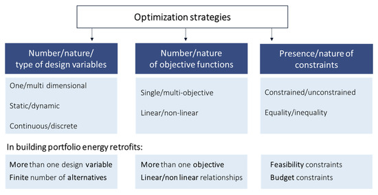 A clear classification of optimization strategies applied to building performance analysis is proposed in [21]. Basically, they can be defined due to the number/nature/type of design variables, number/nature of objective functions, presence/absence/nature of constraints and problem domains (Figure 6).