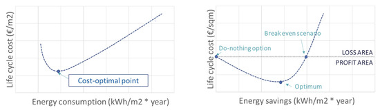 Most of the time, the optimization process is structured as a cost-optimal analysis, performed on global costs and energy consumption. This methodology is required from the European Directive 2010/31/EU [9], where Article 2 defines the cost-optimal level as the energy performance design leading to the lowest whole cost over a predetermined lifecycle. In the cost-optimal calculation investment costs, maintenance and operating costs, as well as costs of disposal, have to be included. The EU Commission Delegated Regulation 244/2012 [142] has later clarified this approach, setting a methodological framework to estimate the cost-optimal levels of energy retrofits in buildings. In general, a cost-optimal analysis is graphically represented as in Figure 7. For any retrofit option, it is shown, on the y-axes, the related LCC (€EUR/year), while, on the x-axes, the corresponding energy consumption/energy savings (kWh/(m2·year)).