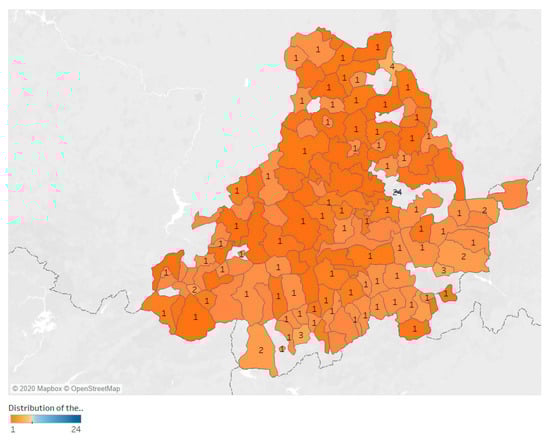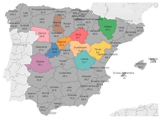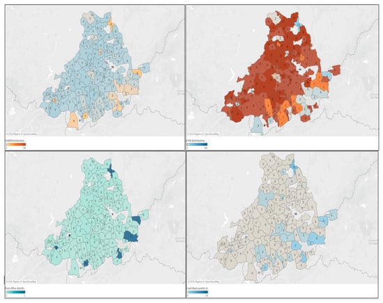 - All information related to banking services in the province of Ávila was analyzed and collected. This included bank offices, savings banks (this figure does not exist in the studies of the authors cited above), and ATMs that dispense cash. In this case, no distinction was made between free ATMs or fee-charging ATMs, and there was no penalty in the index, as other authors have included, when considering fee-charging ATMs (The reason for the non-differentiation was the following: In the Spanish banking system, clients of a bank can withdraw cash at ATMs of another bank or savings bank of which they are not clients with or without a commission, provided that the financial entity is part of the same means of payment system (for example, EURO 6000 or System 4B). However, if certain amounts are exceeded in the cash withdrawal (60, 80, or 100 euros), the client who withdraws money from a bank/savings bank of which he is not a client does not bear the commission. The cash withdrawal fee is borne by the customer’s bank/cashier, and if it exceeds the previous figures, the fee is not passed on to the customer. This is the reason why the withdrawal of cash is “free” or without commission or cost). Postal mail offices were also taken into account, since they provide banking services to citizens, and, additionally, businesses that offer “cashback” services were included, although, it should be noted that this is not a mode that is widely used in Spain, unlike in Anglo-Saxon areas of the world. The appendix presents tables with the data collected for each of the categories (see Table A1).