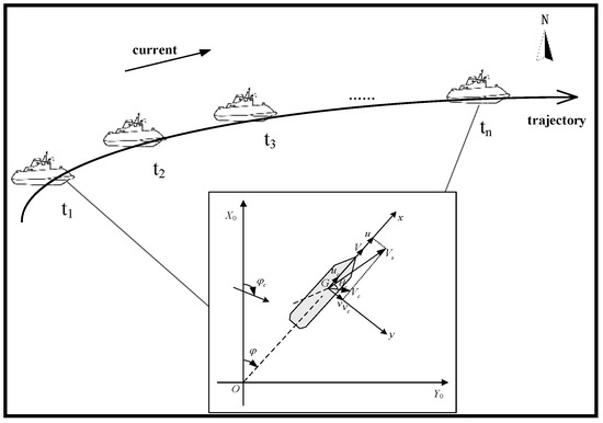The influence of the flow field on ship movement is shown in Figure 2. In the figure, OX0Y0 is the earth-fixed coordinate system, and Gxy is the ship coordinate system. V represents the actual speed provided by the main engine, Vs represents the SOG value in the AIS information, and Vc represents the current velocity predicted by simulation. u and v are the components of SOG in the ship heading and perpendicular to the ship heading, respectively. uc and vc are the rectangular components of Vc. θc is the flow angle between V and Vc.