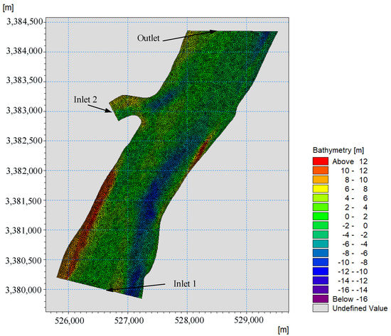 The initial conditions are to simulate the flow velocity and water level at the initial moment. The boundary conditions include open boundary conditions and closed boundary conditions. The former is input with hydrological data obtained by actual observation or interpolation. In this study, we set the given discharge of the inlets and given water level of the outlet. The closed boundary is the riverbank boundary, and the normal velocity component of the boundary is zero.