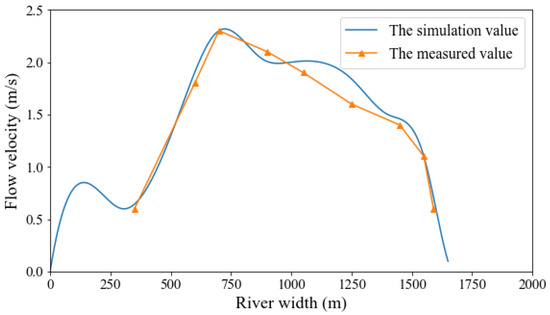 The accuracy of the numerical model of the flow field is the premise of calculation. Surface velocity data of the cross-section were measured and obtained on 22 June 2018, and were used to validate the model (Figure 3 shows the locations of the measured section). According to the data of the Hankou hydrological station, the discharge is 39,835 m3/s and the water level was 24.39 m at that time. By using the mathematical model of the flow field established in this study, the simulated velocity distribution of Section SC1 at a time under the aforementioned parameters was obtained and was compared with the measured value, as shown in Figure 5. It can be seen from the figure that the simulation results are in good agreement with the measured values, which demonstrates that the model parameter selection is reasonable, and the model has a good simulation effect for reflecting the distribution characteristics of the flow field in the study area.