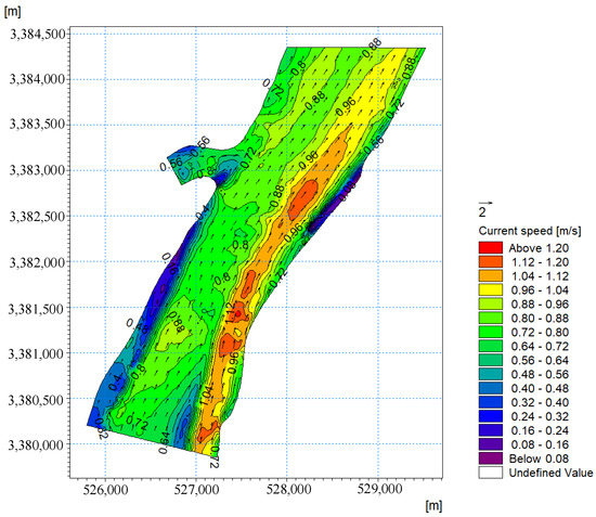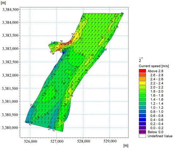 The flow field is influenced by topography, water level, and other factors, and has different characteristics in different seasons. Figure 6 and Figure 7 show the distributions of flow field calculation results in the dry season and the flood season, respectively. In the dry season, the average velocity of the main channel is 0.80–0.90 m/s. The velocity increases with the increase of water depth, and the maximum velocity is 1.20 m/s. During the flood season, due to the increase of the water level, the average velocity reaches 1.8–2.0 m/s, and the maximum velocity at the intersection of the Yangtze River and the Han River can reach 2.8 m/s. Combined with the historical hydrological data of the area, the simulation results can accurately reflect the distribution characteristics of flow velocity and direction in different seasons.