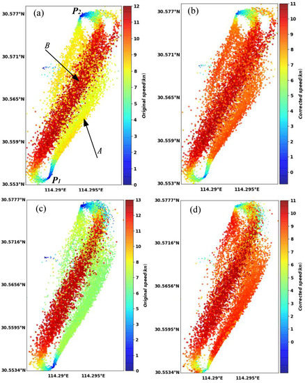 In the inland waters, flow velocity varies greatly at different water levels with seasonality variation; thus, the impact on the ship speed is also different. To evaluate this effect more visually, the simulated flow field data are used to correct the speed of the ferry in January and June, respectively. The spatial distribution visualization of the original speed in the AIS data and the actual speed obtained from correction was performed, as shown in Figure 8. Subplots (a) and (b) in the figure show the comparison of ship speed before and after correction in January, while subplots (c) and (d) are in June. In subplot (a), P1 and P2 represent the location of the Zhonghua Road Marina and Wuhan Guan Marina, respectively, while Arrow A (the yellow cluster) and Arrow B (the red cluster) represent the speed distribution of the ferry sailing up and sailing down the river.