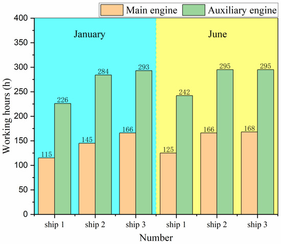To further quantify the influence of seasonal flow field on the calculation of inland ship emissions, AIS data from the three ferries were selected for exhaust emission calculation. After the data were preprocessed, there were 46,395 effective AIS records in January and 44,641 in June. Figure 9 shows the working hours of the main and auxiliary engines of the three ferries in January and June.