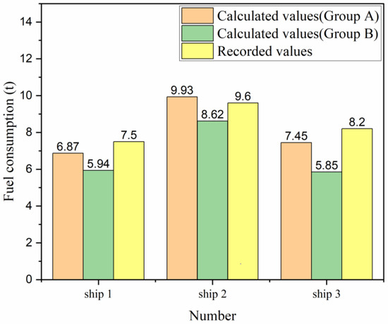In Figure 10, the calculated values and recorded values of fuel consumption of the three ships are compared. In the histogram, the orange bars represent the calculated fuel consumption of the optimized model proposed in this study, the green bars represent the calculated fuel consumption of the traditional model, and the yellow bars represent the actual values recorded in the logbook. It can be seen that the fuel consumption value calculated according to the emission results of Group A is closer to the real fuel consumption (the average error of Group A is 1.8% and that of Group B is 19.3%), which fully indicates that the proposed model is precise. That is, the proposed model can effectively reduce the error in calculation of inland ship emissions compared with the traditional model.