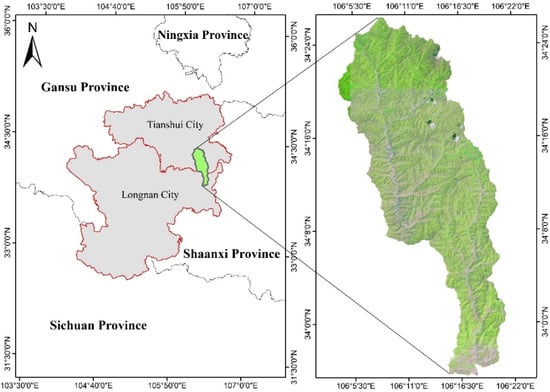 The study area (Figure 2) was established in Xiaolong Mountain (104°23′–106°43′ E, 33°31′–34°41′ N), which is part of the western Qinling Mountain range located in Gansu Province, China. The area has an average altitude of 1600 m and is characterized by a continental monsoon climate. Furthermore, it lies in a transitional region between the temperate and warm temperate zones, with a mean annual temperature of 7–12 °C, mean annual precipitation of 750 mm, and mean annual sunshine duration of 1520–2313 h, as well as an annual average frost-free period of 175 days. The vertical distribution of forest soil showed a significant difference, which showed a mean soil thickness of 30–60 cm and a mean soil pH of 6.5–7.5. The forest communities mainly consist of Quercus aliena var. acuteserrata, Quercus liaotungensis, Lauraceae. Obtusiloba BI., Pinus armandii Franch. and Tilia tuan Szyszyl. Quercus aliena var. acuteserrata dominates the study area’s vegetation and represents >50% of the forest composition.