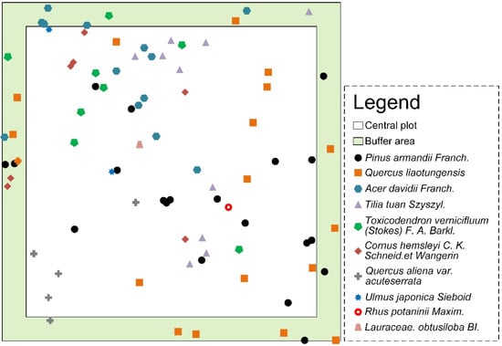Compared to the pure forest, the mixed forest showed more complexity in the crowns’ vertical structure. Herein, to verify the TOI’s vertical evaluation capability, we selected six natural mixed forest plots (Table 1). All six plots were established in May 2008 at an altitude of 1700–1800 m and were resurveyed in 2013. Based on the method proposed by Husch et al. [], each square plot had a diagonal distance of 40 m and an overall area of 800 m2. To avoid the edge effect, a 2 m buffer zone was implemented, which divided the square plot into the buffer area and central plot (Figure 3). In addition, we measured and recorded the DBH (diameter tape, accurate to 0.1 cm), tree height (Blume–Leiss height indicator, accurate to 0.5 m), clear bole height (sliding staff, accurate to 0.1 m), crown diameter (tape measure, accurate to 0.1 m), tree age (increment borer), and the relative coordinates of trees in each plot (total station) of all trees with a DBH 5 cm. The altitude, aspect, slope, soil layer thickness, and coordinates of each plot were also recorded. The basal area increment (BAI) was calculated based on initial DBH and resurveyed DBH [].