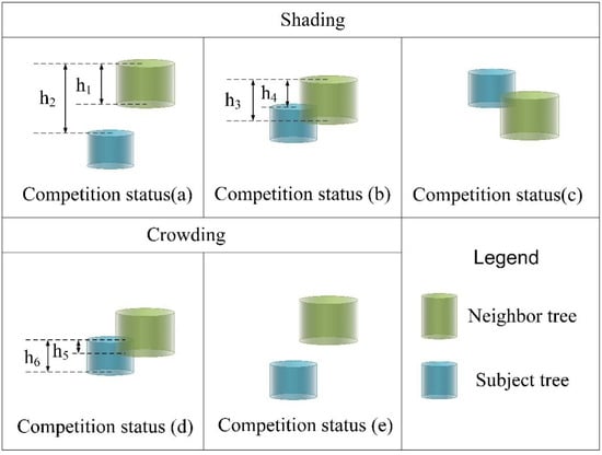 The subject tree’s growth is also highly influenced by competitive pressure from space packing and physical crowding []. These competitive pressures originate from branch interlacing, and may reduce the subject tree’s vigor by facilitating foliage and branch loss. To precisely describe these competitive pressures, we used a three-dimensional cylinder based on crown abstraction in the “crowding” model, as opposed to using projected circles in the AO index. Using the crown length and vertical position of each tree, we modified the AO index by adding the trees’ vertical crowding status and dividing the “crowding” competition status into two distinct groups (Figure 4): competition status (d)—where the subject tree’s crown shared space with its neighbor in the vertical dimension; and competition status (e)—where the subject tree’s crown shared no space with its neighbor in the vertical dimension. To quantitatively describe these different crowding statuses, we proposed a crowding coefficient , as follows: