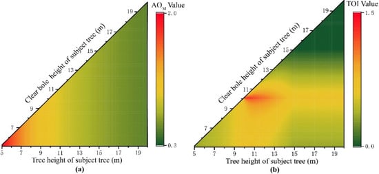 In the individual-tree simulation, we tested the efficacy of the AOM index and TOI to express vertical competition. In general, the TOI and AOM index value distribution exhibited significant discrepancies throughout the simulations (Figure 5). The AOM index showed a negative correlation with the subject tree’s height and was not influenced by the clear bole height (Figure 5a). The maximum and minimum of the AOM index values appeared when the tree height of the subject tree was 5 and 20 m, respectively. Overall, the AOM value distribution was unable to express vertical changes in the relationship between crowns. The subject tree’s TOI value is highly influenced by both tree height and clear bole height (Figure 5b). The minimum TOI value appeared when the subject tree’s clear bole height and tree height were (15, 20]. Under this condition, the lowest part of the subject crown is higher than the highest part of its neighbor’s crown; thus, the subject tree did not suffer competitive pressure from the neighbor’s crown. The maximum part of the TOI value appeared when the subject tree’s height was [,], and the clear bole height was around 10 m. Under this condition, the subject tree suffered both relatively high “shading” and “crowding” pressure from the neighbor tree. Overall, the TOI values’ distribution trend indicates that the TOI can express changes in the relationship between crowns.