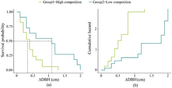 Based on the K-means cluster results of the TOI values, we divided the dead trees into two groups. The dead trees whose TOI values were lower than 1 belonged to the low-competition group; otherwise, they belonged to the high-competition group. The results of the Kaplan–Meier analysis (Figure 6a) showed that the survival probability of the low-competition group is higher than that of the high-competition group, which indicated that higher competition might induce the increase of trees’ death rate. The 50% survival probability showed when reached 0.4 in the high-competition group and 1.1 in the low-competition group (Figure 6a). For both the low- and high-competition groups, the curve of cumulative hazard increases while increases (Figure 6b), which indicated that trees with a faster growth rate faced a higher hazard of death. The coefficient of the Cox analysis (Table 4) was −1.0703 and passed three different tests, indicating that trees in the high-competition group suffer a higher risk of death than trees in the low-competition group. The hazard ratio in the Cox analysis was 0.3429, which indicated that trees in the low-competition group had a reduction of 65.71% (or suffered only 34.29%) of hazard risk compared to the high-competition group.