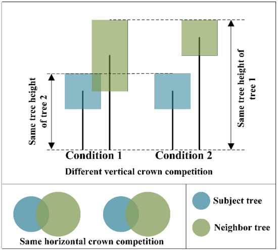 As stated above, the competition among trees can be characterized as aboveground and belowground. The aboveground competition primarily focuses on the competition for light and growing space [,,]. Thus, concerning the horizontal dimension, many CIs have been developed to focus on the crown’s effective projection area [] to evaluate the actual light and space competition. However, the light and space competition among trees in the vertical dimension is more complicated and assumed to be size-asymmetric []. As such, the vertical dimension has not been legitimately evaluated with previous CIs []. For example, a shorter tree undergoes disproportionate pressure from light competition due to the shading effect of taller trees []. In this scenario, the taller and shorter trees were exposed to the same magnitude of competitive pressure from each other, which is recognized as symmetrical. However, this competition pressure may require higher resistance from the shorter trees, which is manifested in longitudinal growth, and, subsequently, an asymmetric effect is produced. Thus, incorporating only the size ratio (e.g., DBH ratio according to Bella [] and volume ratio according to Ek and Monserud []), expressing the symmetric competition in a CI may not express the trees’ actual vertical competition status.