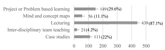 Integrating these results with the analyses of study contents—of the case study (i.e., with curricular units that were aligned for Sustainability)—it was observed that the Faculty of Sciences had the largest number of this kind of curricular units. In turn, business sciences and economy, which had four units focused on environmental policies in SD in Spain, social responsibility, and sustainable economics gave some relevance to project- or problem-based learning, case studies, and mind and concept maps. The Teacher and Training degree, which had three units focused on environmental Sustainability, gave some relevance to interdisciplinary approaches, case studies, and projects. The Law degree, which had only one CU aligned with the policy and problems related to environmental Sustainability, also had a significant percentage of case studies and project or problem-based learning (in line with its nature).