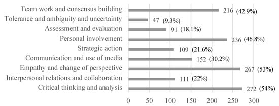 The results of this topic (Figure 2) reveal that Critical thinking and analysis (54%) was the most common approach chosen by students, followed by Empathy and change of perspective (53%), Personal involvement (46.8%), and Teamwork and consensus building (42.9%).